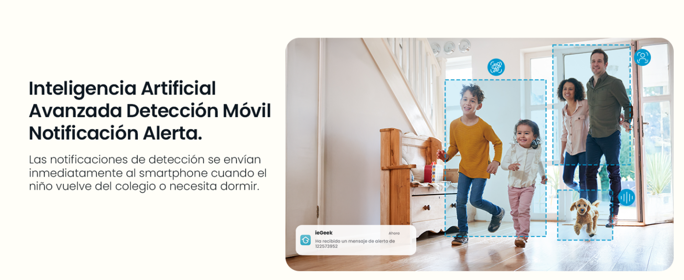 Avisos de movimiento, sonido, detección humana y zonas personalizadas.