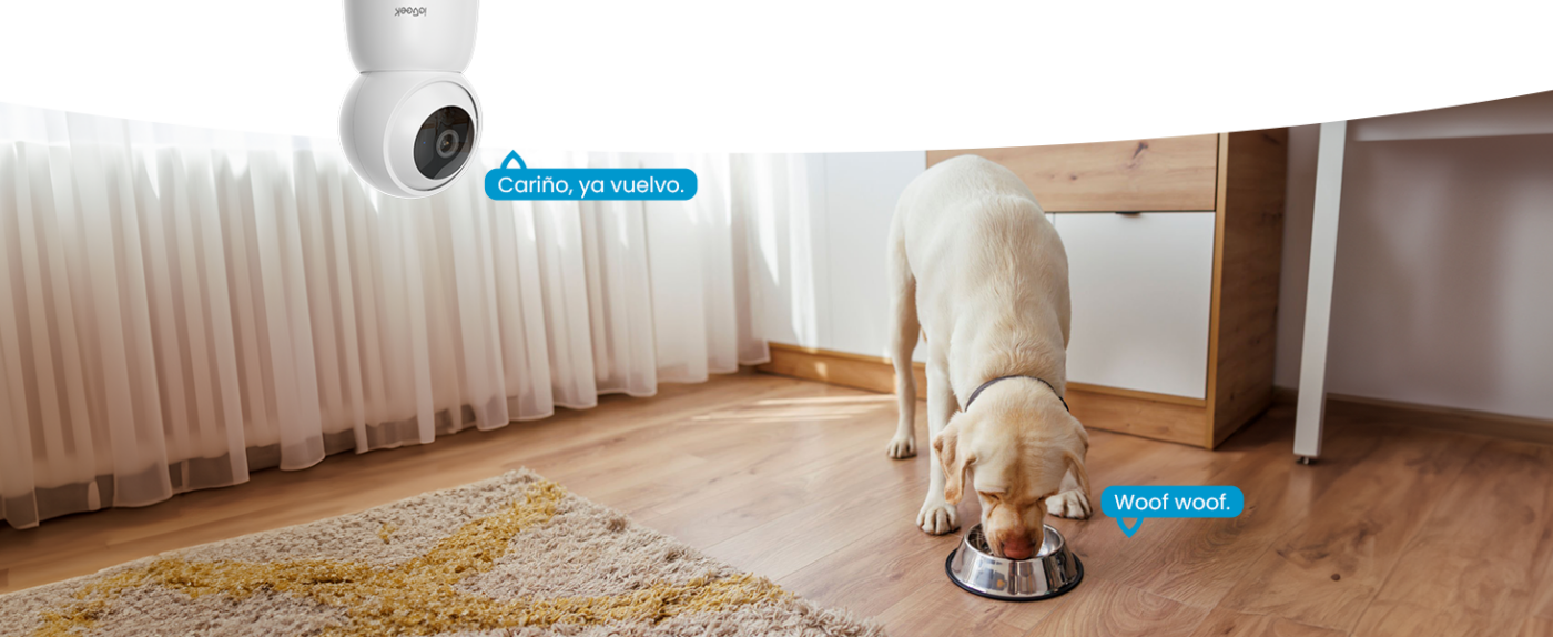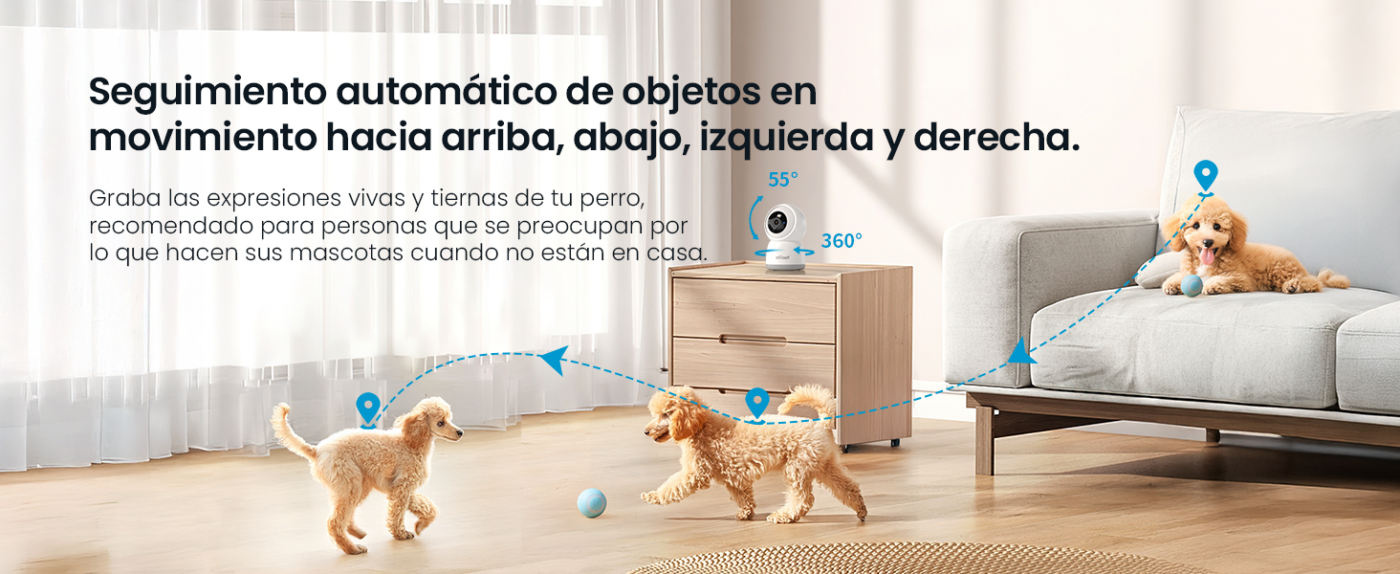 Cámara de vigilancia interior 2K/3MP con WiFi dual-band (5GHz + 2,4GHz) para conexión ultra-estable. PTZ 360° motorizado con seguimiento automático inteligente y visión nocturna 15m. Ideal para vigilar bebé, mascotas, personas mayores.